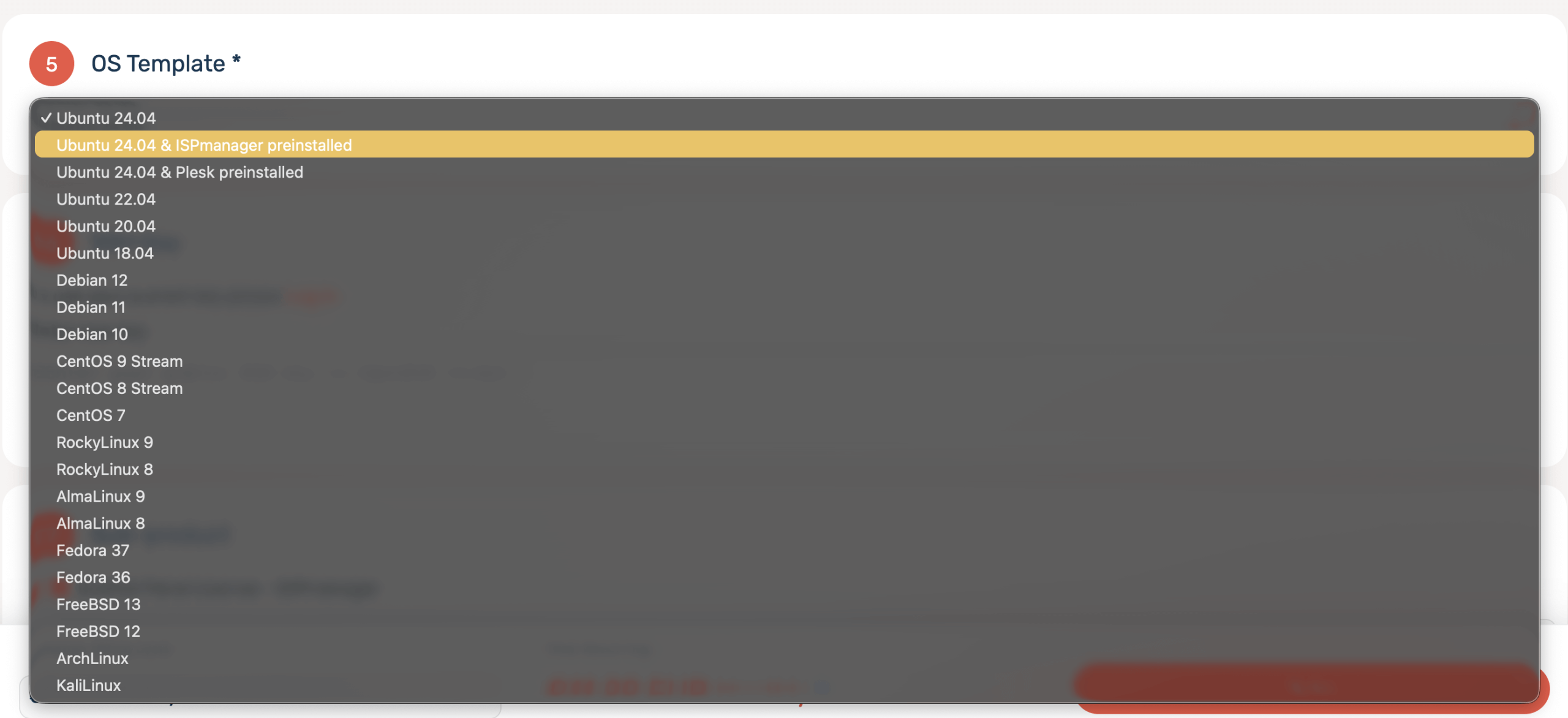 First you need to Select a VPS plan and proceed to checkout. Choose the server tariff that best fits your needs and continue to the ordering page. After that please confirm the preinstalled image. On the order summary you will see the selected image: Ubuntu 24.04 with ispmanager preinstalled. This indicates that the server image includes a ready-made ispmanager installation.