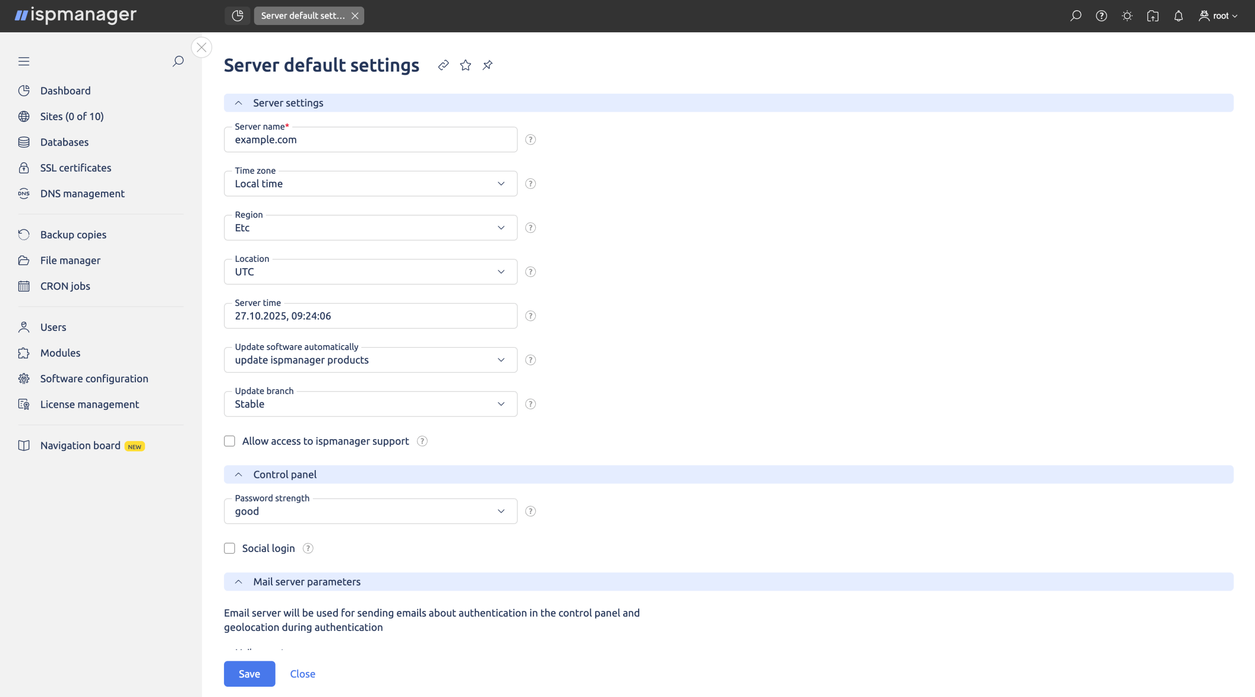 If ispmanager was installed with custom settings, the listening port may have been changed in the configuration—but 1500 remains the standard default. Enter the root username and password provided in your VPS credentials to log in to ispmanager. These credentials give you full administrative access, allowing you to configure your server, install applications, and manage websites directly through the control panel.